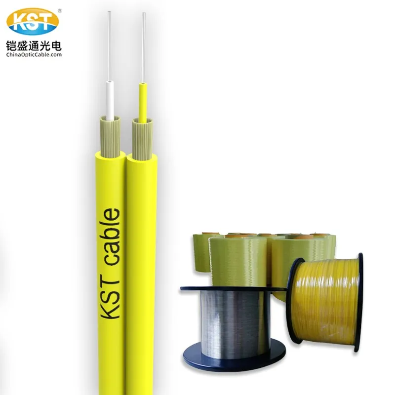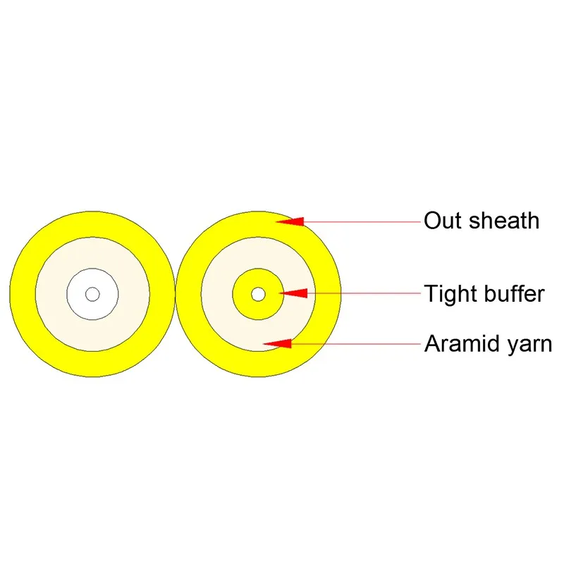 Duplex Fig-8 cable uses a single Φ900μm or Φ600μm tight-jacketed optical fiber as the optical transmission medium, covered with a layer of aramong as the force strengthening unit, and extruded with a layer of polyvinyl chloride (PVC) 、low smoke halogen-free material (LSZH, low smoke, halogen-free, flame retardant) and Polyurethane(TPU)sheath.